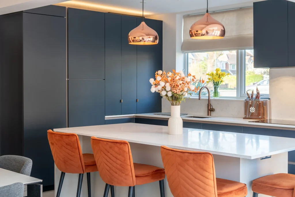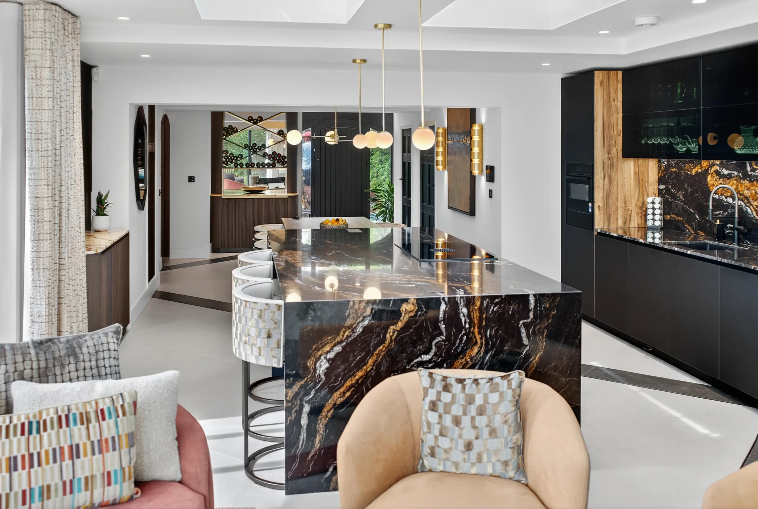 A bold contemporary kitchen combining deep tones with warm metallic accents for a striking, modern finish.